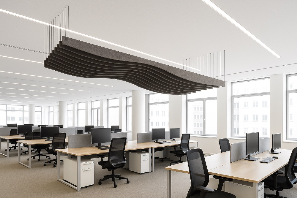 Wave blade ceiling baffles feature a flowing, sculptural profile that mimics the gentle motion of water in motion. The softly curved edges create a dynamic rhythm across the ceiling, enhancing spatial energy while delivering effective sound control. Designed for modern interiors that balance movement with tranquility, Wave transforms overhead space into a calming visual experience.