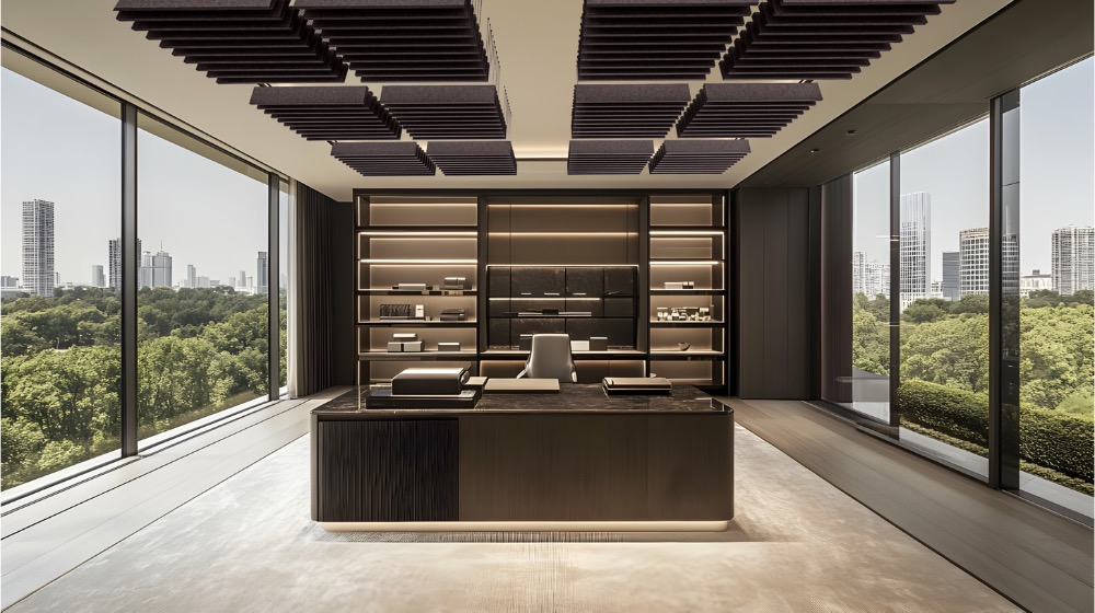 Wedge acoustic ceiling baffles provide exceptional acoustic control with their angular, sculptural form. Engineered to effectively diminish reverberation, these panels lend a contemporary elegance, turning ceilings into visually appealing focal points in any upscale setting.
