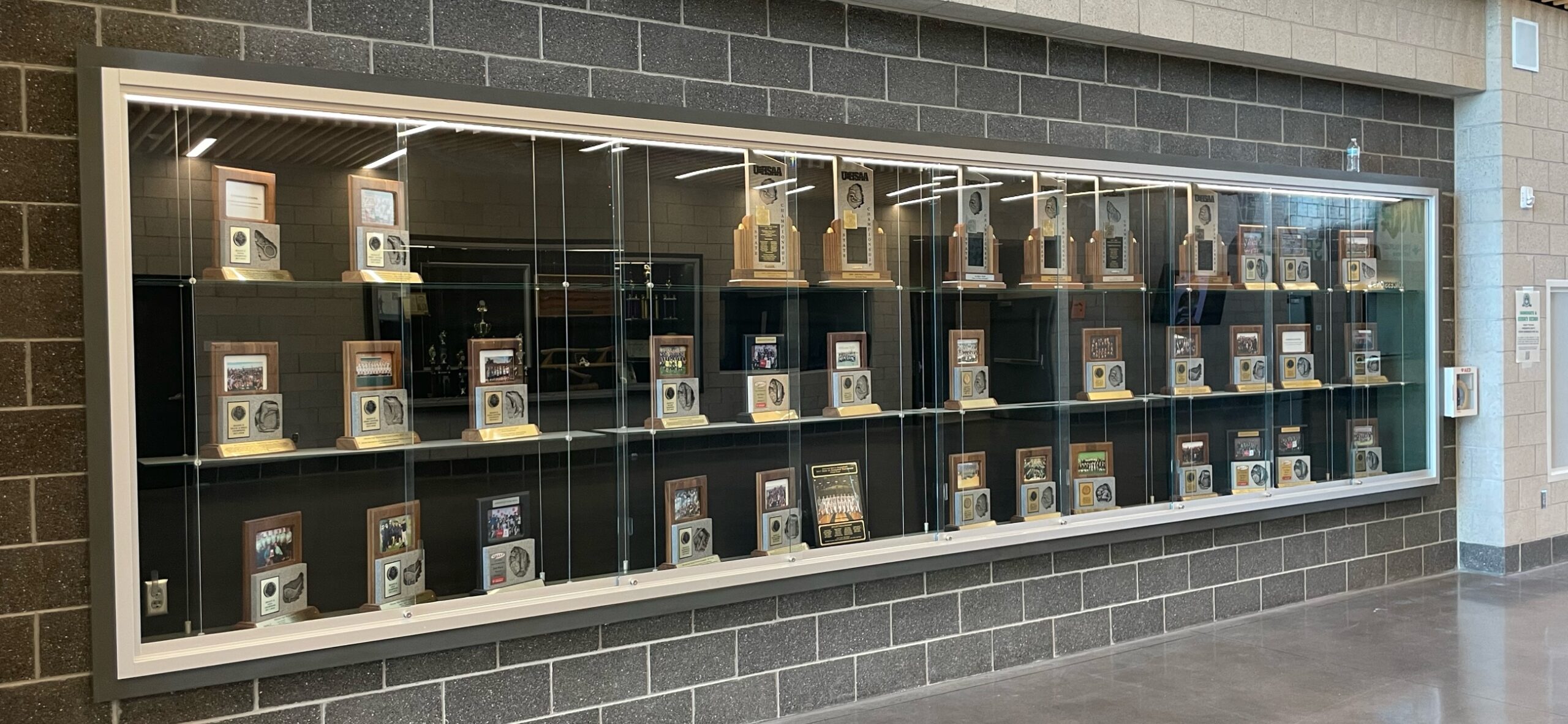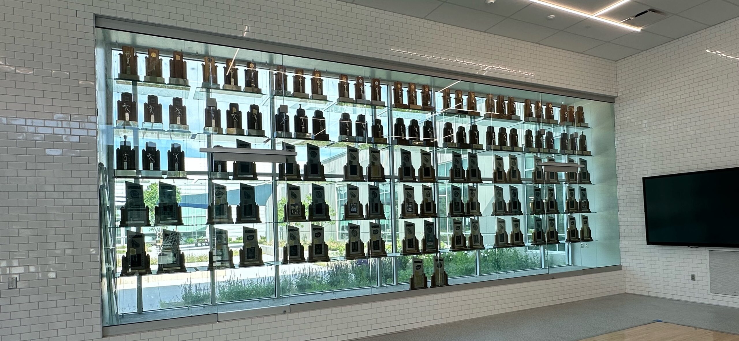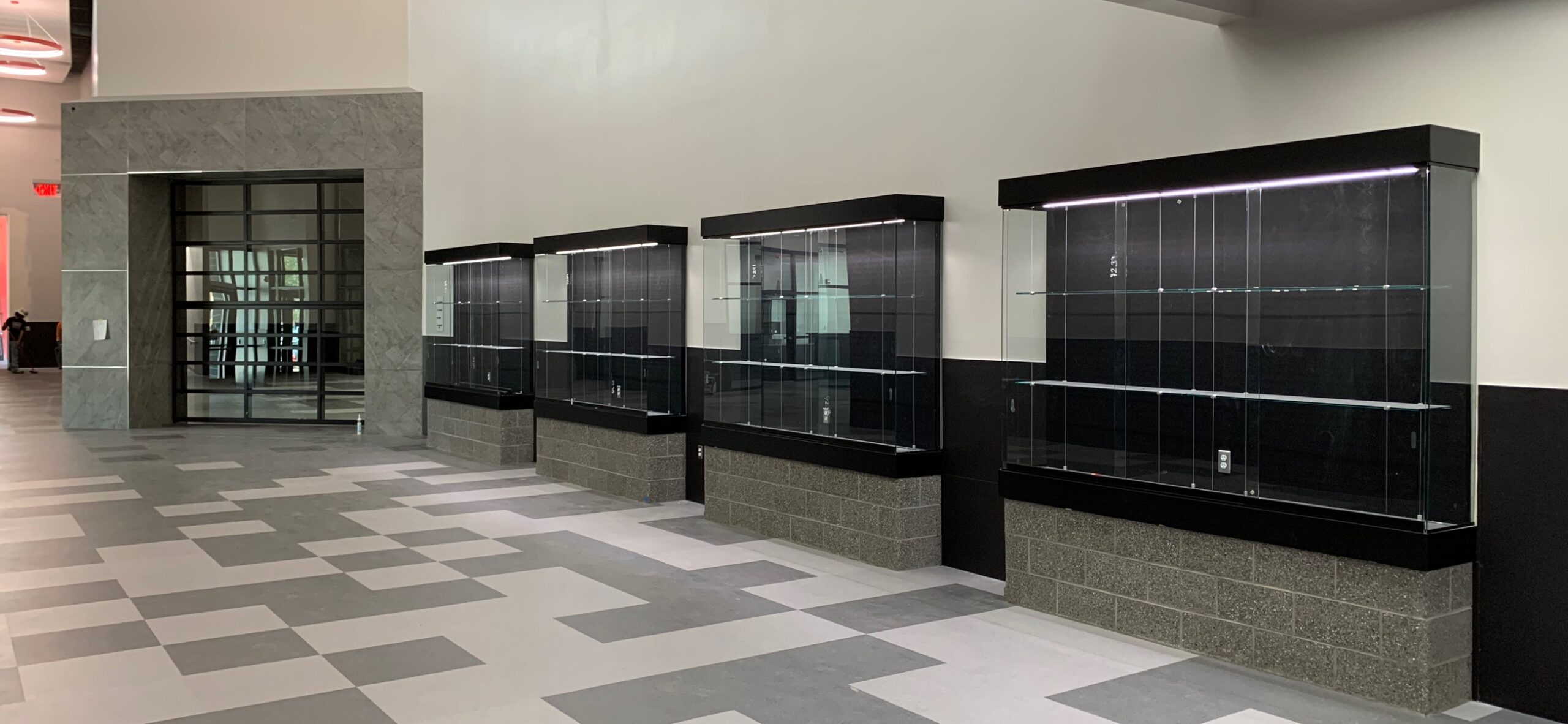 ShowVault™ Pivot Door trophy display cases are built-in architectural showcases engineered for high-traffic environments where visibility, security, and design all matter. Featuring a full-framed aluminum body and pivoting tempered glass doors, these cases offer front-facing access without sacrificing the clean, streamlined look. Whether recessed into a single wall or installed as a double-sided room divider, ShowVault™ offers unmatched flexibility with premium finishes and acoustic PET felt backing to reduce glare and echo.