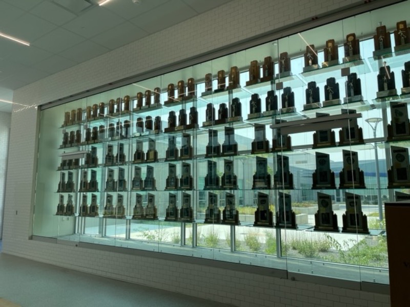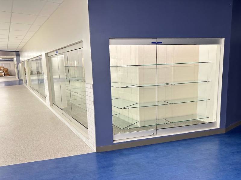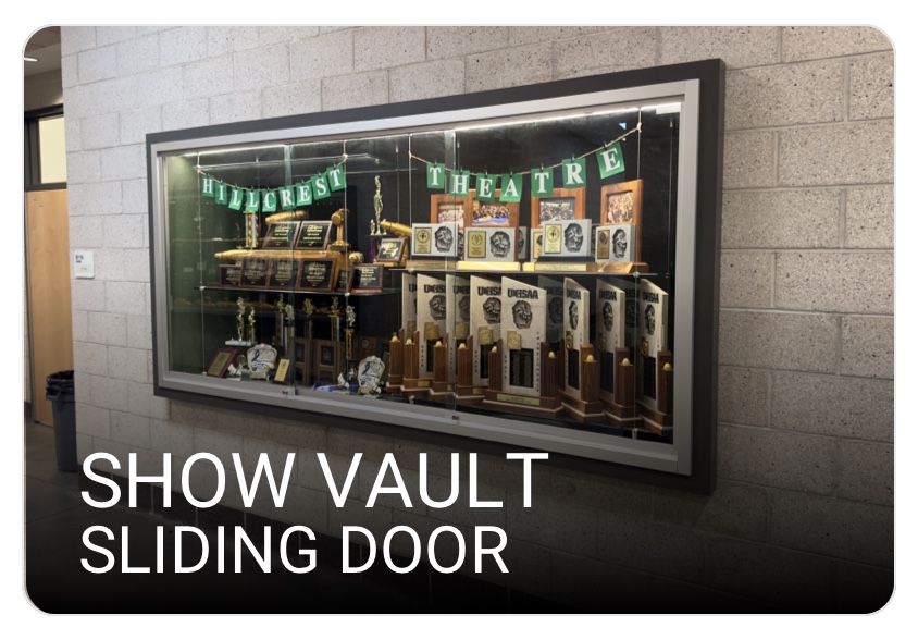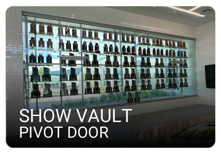 ShowVault™ Pivot Door trophy display cases are built-in architectural showcases engineered for high-traffic environments where visibility, security, and design all matter. Featuring a full-framed aluminum body and pivoting tempered glass doors, these cases offer front-facing access without sacrificing the clean, streamlined look. Whether recessed into a single wall or installed as a double-sided room divider, ShowVault™ offers unmatched flexibility with premium finishes and acoustic PET felt backing to reduce glare and echo.