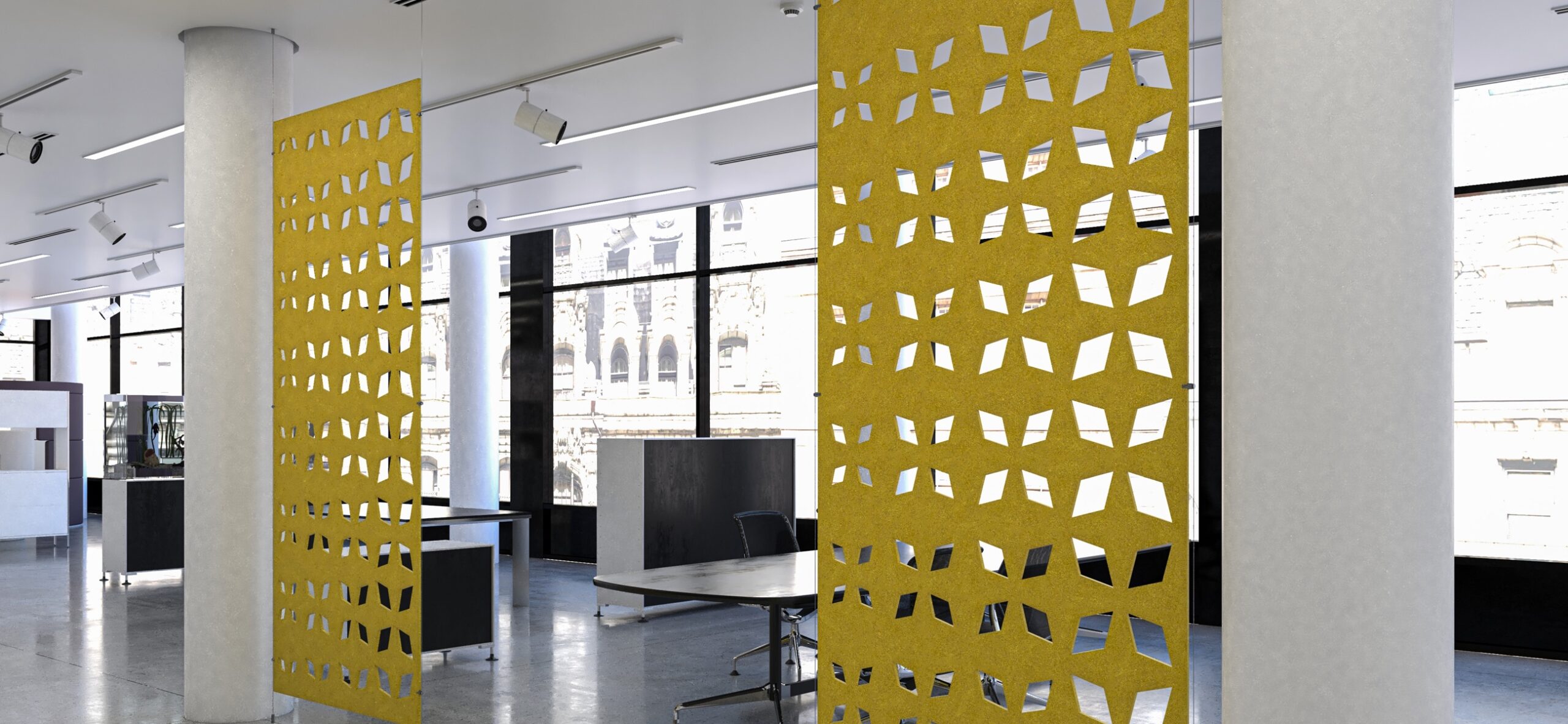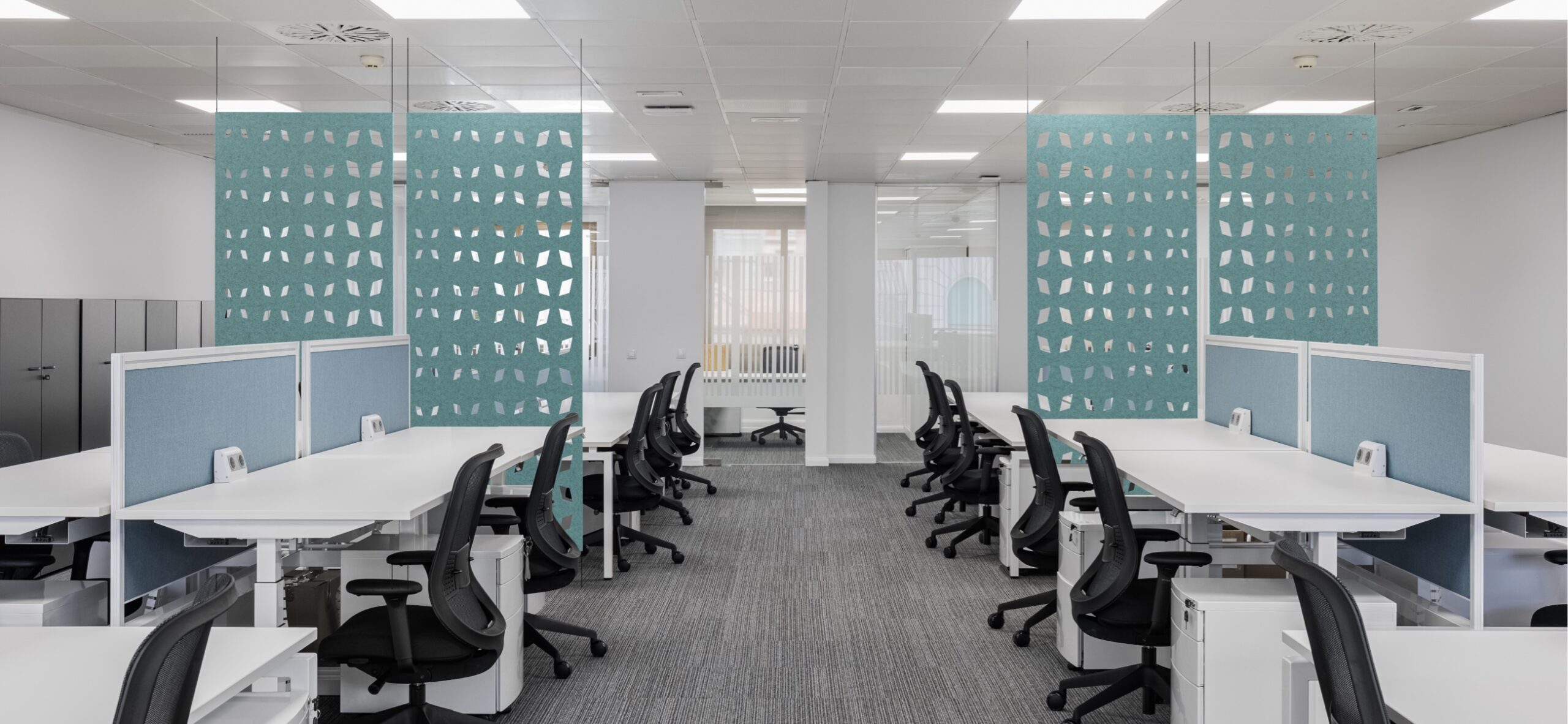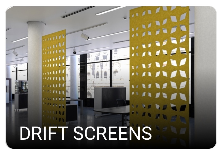 Drift hanging acoustic screens deliver effortless spatial separation with modern style. Available in a range of colors and patterns. Drift screens bring modern acoustic design to life in offices, classrooms, and shared spaces.